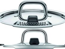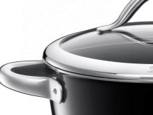 Pans with an interesting design and high characteristics are presented in different volumes from 2 to 6 liters. The cookware is made of high quality stainless steel, has a sparkling case and a transparent lid with an opening for the exit of steam. The double bottom technology allows you to quickly and evenly heat the dishes. Ergonomic handles do not heat up.