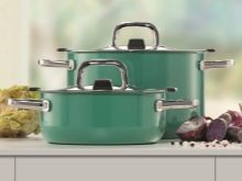 This line has wide functionality and an interesting design. The bright shade of the dishes will cheer you up and fill the kitchen with color. The series includes pans from 2 to 6.5 liters. Each device has a very elongated core of steel, the dark-colored inner coating has non-stick properties, which contributes to easier and more useful cooking without the use of a large amount of oil.