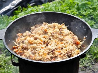 Variants of forms are also diverse: oval, round, elongated, high, understated, with one or two handles. All this depends on the desire of the buyer, so there are no strict rules here. It is important to consider the place where you should cook. Pay attention to the hemispherical shape, which is the standard for cooking on an open fire, but for the gas stove it is necessary to use special supports. If you choose a cauldron for a gas stove, then we recommend a volume of up to 6-8 liters, which corresponds to the pilaf norm for 6 people tentatively.
