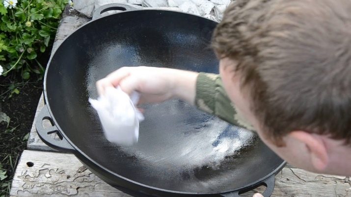 At the end of cooking, the dishes are washed and wiped dry. The appearance of rust stains on a cast iron product will help prevent the process of rubbing dishes with an oil-soaked soft cloth. If something burned out in a cast-iron cauldron, then it should be soaked with water. Then pour 1 kg of salt and calcine thoroughly. Allow the product to cool and remove the salt. After cleaning, a container should be baked with oil, as recommended before first cooking.