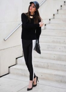 With caps of dark shades, light, romantic sets are perfectly combined. For example, warm leggings, shoes or low-heeled ankle boots, sneakers, a light jumper or a beautiful knitted dress with tights will be a great choice for an autumn walk. For a summer outing, it is worth choosing sundresses, denim overalls, sports sets (including with shorts).