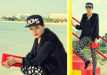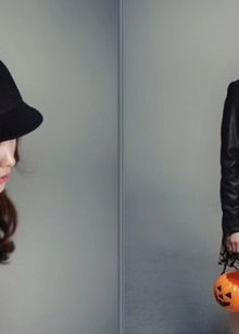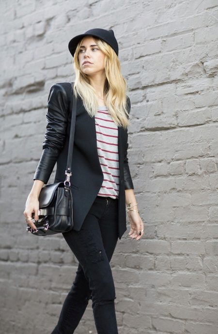 The first girl shows us a street style: comfortable dark trousers, a loose T-shirt, a jacket with leather sleeves. A cute black cap with ears complements this look. Despite the business look of the model, the headgear fits perfectly into the concept thanks to the right colors and accessories, adding a touch of relaxation.