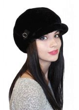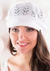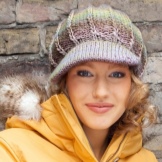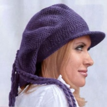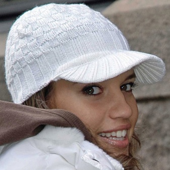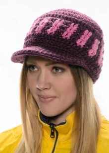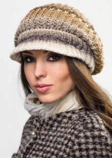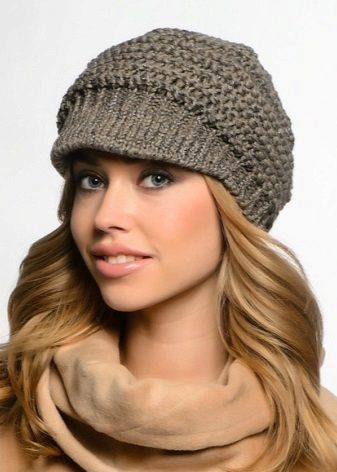 - Volumetric knitted cap with a small visor. As a rule, such products are made of thick yarn or double viscous, have large patterns.