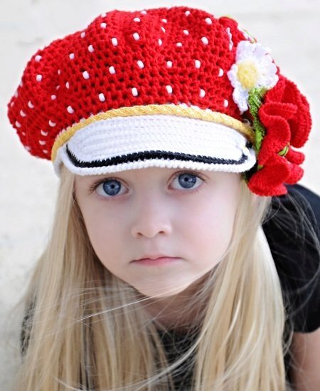 An adorable baby hat for late spring and early fall. The main part of the cap, crocheted, made in bright red with white dots. The miniature visor is knitted with white thread and has a black edging. On the side of the product is decorated with chic white and red flowers. The girl’s black t-shirt is combined with a fringing on a cap. And the red color always goes to blondes, even so small.