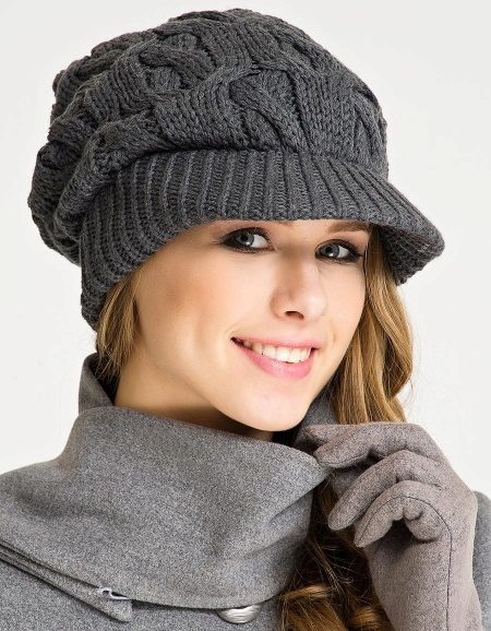 A model of a similar style, with a massive top and a neat visor, but already monophonic with a beautiful graphite shade. A pattern of intricate braids is already completely appropriate here - it makes the knitting voluminous. The rest of the clothes are made in a lighter gray color scheme (coat and gloves), which is surprisingly in harmony with the girl's light brown hair.