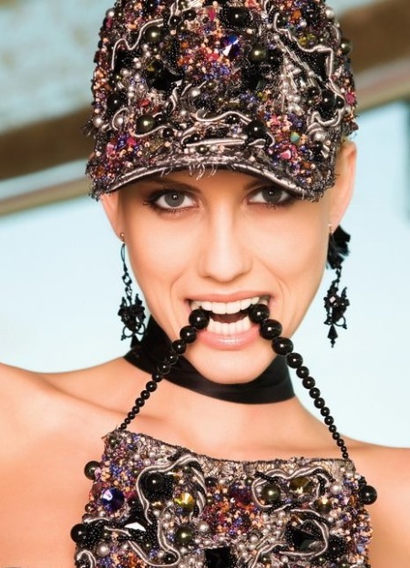 - Caps in a glamorous style are decorated with prints, stickers, rhinestones, stones and crystals. There are a variety of colors and styles.