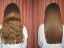 - Owners of curly and naughty strands can forget about the untidy and curly hairstyle for a long time. After keratin straightening, the hair becomes perfectly straight and silky, and this effect will remain for several months.