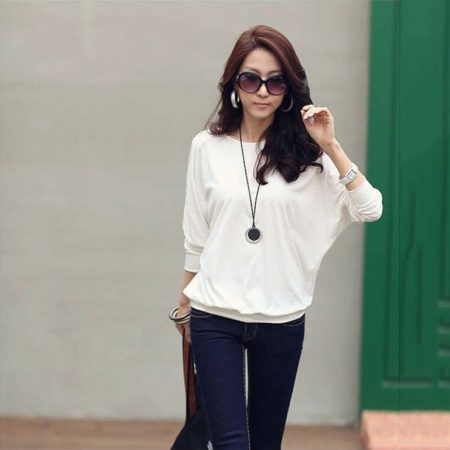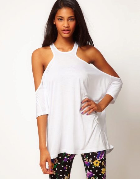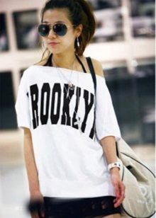 Sweatshirt on one shoulder returned to fashion a few years ago. It will help to add coquetry to the image, and also give a feeling of comfort and convenience. It can be worn not only by girls, but also by women of age. This model combines wonderfully with trousers, tapered down, or with a pencil skirt.