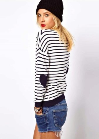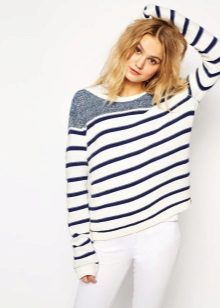 White sweater in black stripes is also in trend, since contrasting colors always look relevant, fresh and bright.