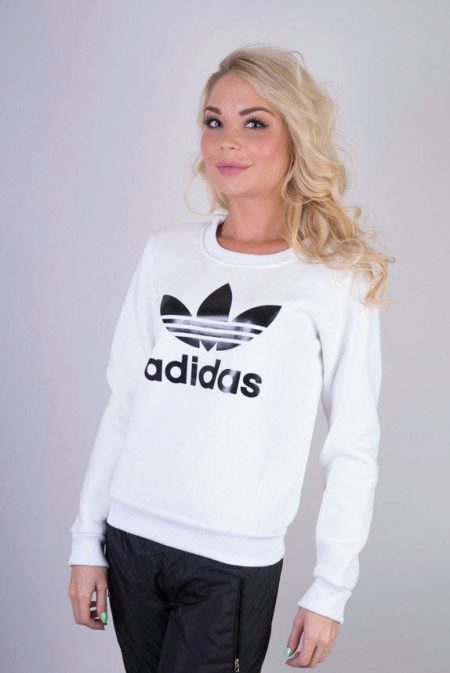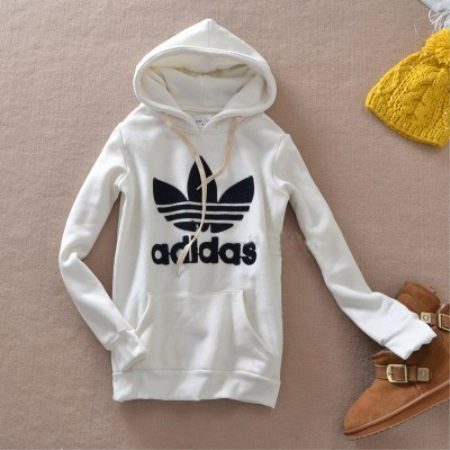 Adidas offers white sweatshirts made of fleece, which is soft and does not let heat out. This model will keep you warm in cold, dry weather.