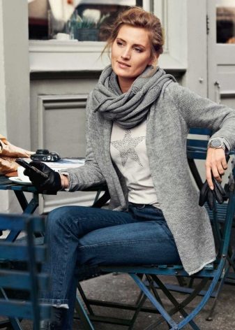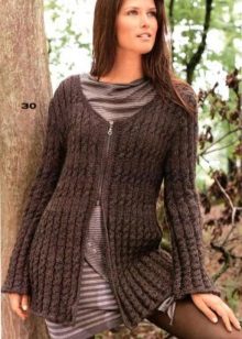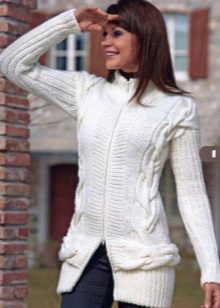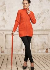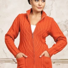 The elongated fitted jacket of thick knitting is perfectly combined not only with jeans or trousers, but also with a skirt.