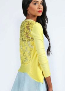 A lace blouse made of milk or pale pink lace in combination with a plain a-line, flared skirt or pencil skirt will make an excellent set for a special occasion. Lace sweater can be used as an independent piece of clothing or in combination with T-shirts, tops and t-shirts.