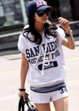 - Denim shorts, a T-shirt and sports shoes. This is an option for a cool summer evening, which is suitable only for slim girls.