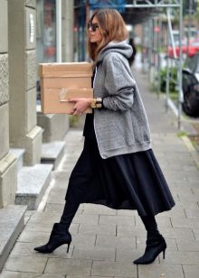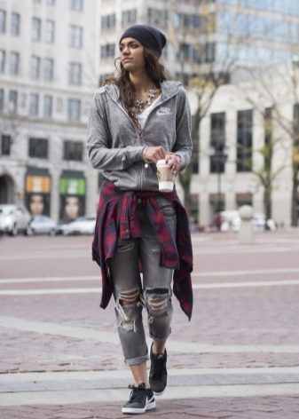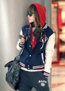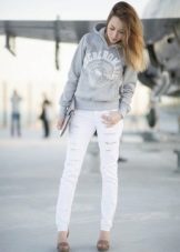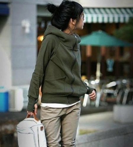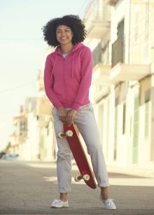 Since sweatshirts with a hood are a sporty style, they are not worn with strict trousers or classic skirts. The most common such versions of ensembles with a jacket with a hood: