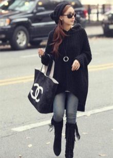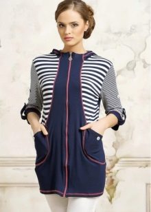 Long jacket. Such a jacket in the presence of a special cut front pocket is called a kangaroo. It is often decorated with a bright print, inscription or sports emblem.Elongated feminine knitted sweaters are also very common. They are worn in autumn in warm weather instead of a coat, wearing with skirts, trousers and beautiful boots.