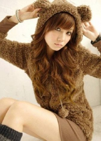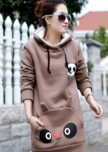 With ears and glasses on the hood. Such sweaters look very cute and funny, so they are in demand among young people. Thanks to the charming ears, the image becomes more feminine. Such a jacket looks good with jeans, and with a fluffy skirt, and with leggings. As a rule, fleece sweatshirts with ears are offered for the cool season.