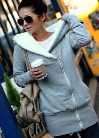 Jacket with a zipper. This clasp is very popular for sweaters complemented by a hood. Made from knitwear, this model is called a sweatshirt. It is worn in cool weather instead of a jacket or sweatshirt-sweatshirts.