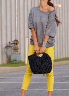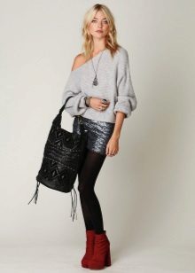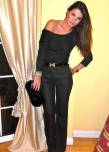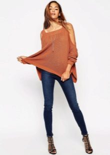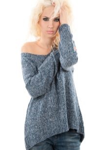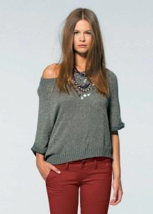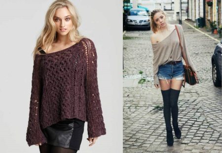 Combination is the main principle in the selection of clothes. Knitted sweaters with an open shoulder go well with elements of the wardrobe such as a pencil skirt or a floor skirt, with straight or narrowed trousers, with denim, finally. It is important to consider your visual parameters in accordance with the fashion.