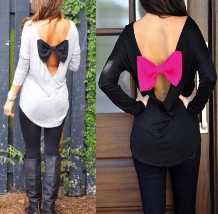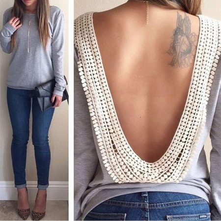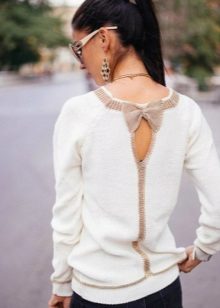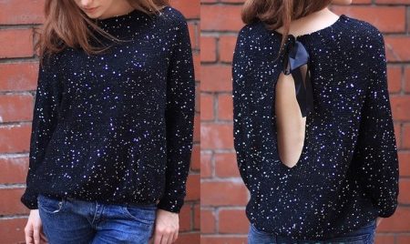 Sweatshirts with open backs are perfect for young fashionistas and successful ladies. A well-selected set of top and bottom allows you to create an incredibly harmonious, even flawless image. For different models of sweaters, part of the bare back can be located both above and below the product. You can wear a sweater with a beautiful ribbon at the back, this will help emphasize the femininity and grace of the figure.