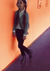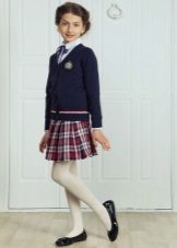 Most often, a school sweater is combined with dark trousers and a light (often white) satin blouse or a cotton shirt. Also, the sweater is worn with a skirt and a blouse, and in the cool season, the sweater can complement the outfit from a sundress and turtleneck.