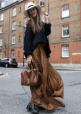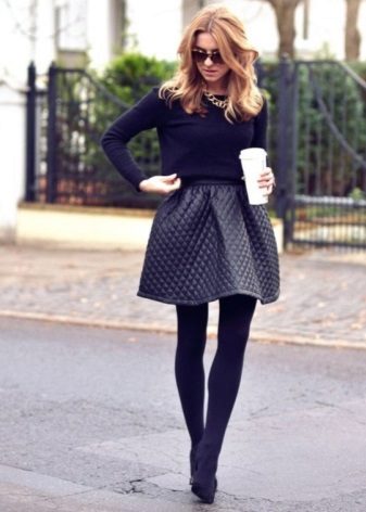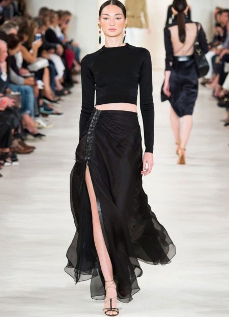 To create a spectacular evening look, a cropped black knitted sweater in tandem with an elegant black skirt with a slit from the hip and a small flare down is perfect. Stiletto sandals will add elegance and elegance to the look.