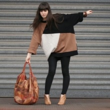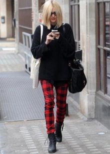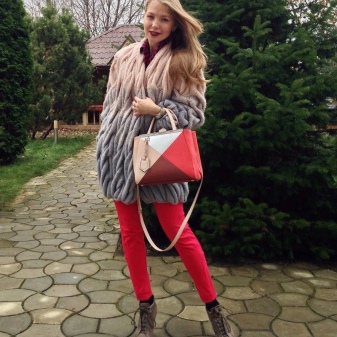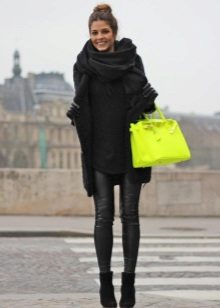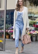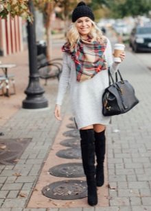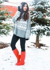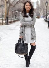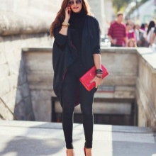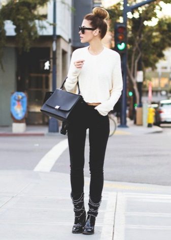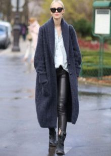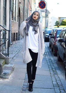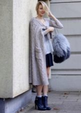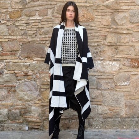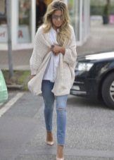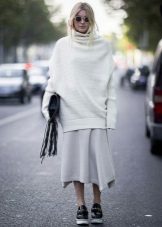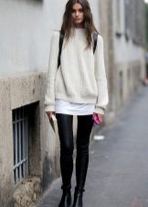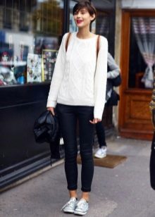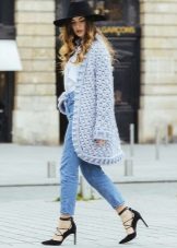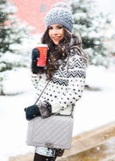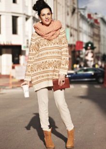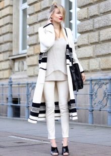 In cold weather, a warm elongated white cardigan decorated with geometric shapes will be an excellent solution. It can be worn over a black and white sweater in combination with dark trousers. Jewelry is optional, high boots with laces perfectly complement the spectacular look.