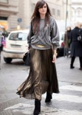 Light gray sweaters can also be used to embody an elegant business look. They should be combined with white shirts and gray checked skirts. Dark color models will be popular in winter. A dark blouse can be worn with a burgundy leather skirt. High-waisted skirts are trending.