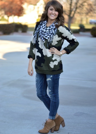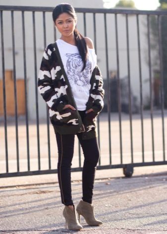 In the fall season, you can purchase a stylish jacket decorated with a camouflage print. It can be a cardigan or a jumper that will look good, both with jeans and skinny pants.
