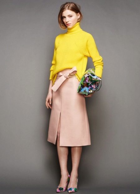 Bright colors are back in trend, because he wants to decorate an autumn day. The yellow sweater looks great in combination with an elegant pale pink skirt slightly lower than the knee and decorated with a stylish bow. Floral stiletto heels are in perfect harmony with a small handbag matching the tone of the shoe.