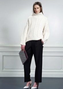 A classic white sweater with a slightly elongated back and trendy braids is a stylish outfit for both business and casual look.