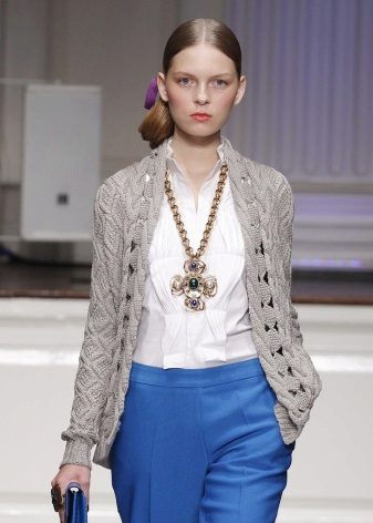 One of the most popular materials for women's blouses today is cashmere. It looks great, pleasant to the touch, has excellent heat-shielding characteristics. Today, cashmere jumpers, cardigans and cardigans can be found in fashion collections of famous brands and fashion designers. A woolen or jeans jacket will also look stylish and relevant.