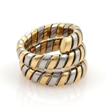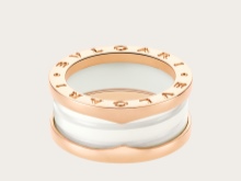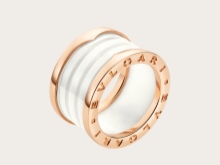 Each model is made on the basis of gold, which is a wide hoop with an extruded center. The gold base is complemented by a ceramic, marble, or steel middle. At the center of the products is the unique Bvlgari spiral.