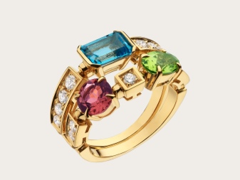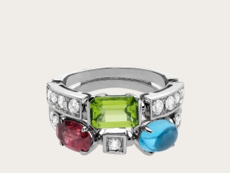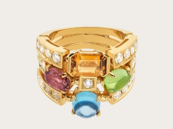 The true embodiment of Bvlgari’s free spirit is an incredibly vibrant collection full of bold colors. Two and three-row articles of predominantly white, and sometimes yellow gold, accompanied by multi-colored stones towering on the rim - peridot, citrine, blue topaz, pink tourmaline.