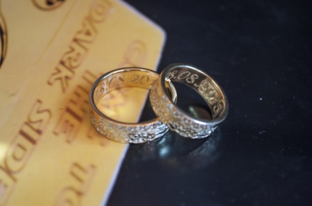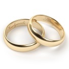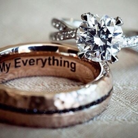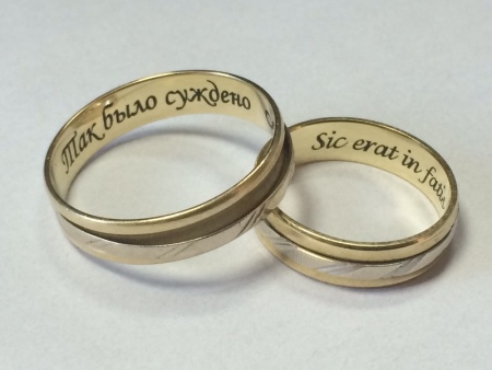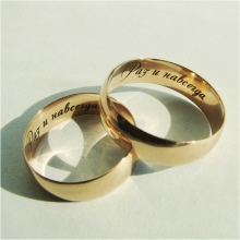 Most often for the bride and groom on the rings engrave their names or the date of the marriage. Also popular is the idea when half the expression is applied to paired jewelry. You can use ready-made examples of phrases applied to wedding rings.
