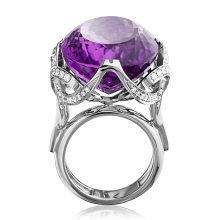 If you want to create a truly royal look, then you should look at interesting gold rings with amethysts. This stone has a noble purple color, which can be almost transparent or dense and saturated. Against the background of white metal, the mineral looks very feminine and romantic.