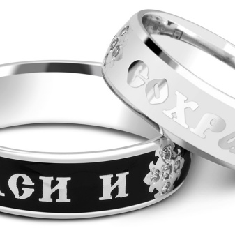 Rings with religious symbols are also popular today. These include products "Save and save." Such specimens of white gold look especially light and harmonious. They can be supplemented by Orthodox prayer on the inside or outside. Jewelers often add dark enamel to these accessories to highlight letters on the surface.