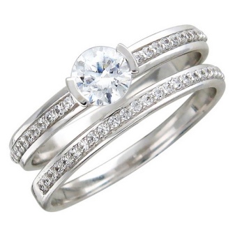 On the shelves of jewelry stores you can find a huge number of double rings. They put on one finger. Such specimens of white gold are often complemented by Swarovski crystals or diamonds.