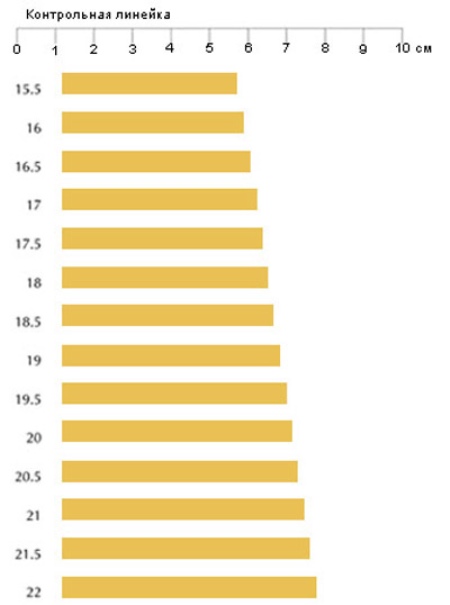 For this method, instead of thread, you can use a paper strip. Before drawing conclusions with respect to the obtained indicators, it is worth making sure that the scale above the size table corresponds to 10 cm. The format may change when saving the image or printing.