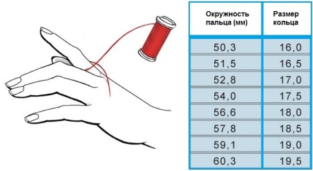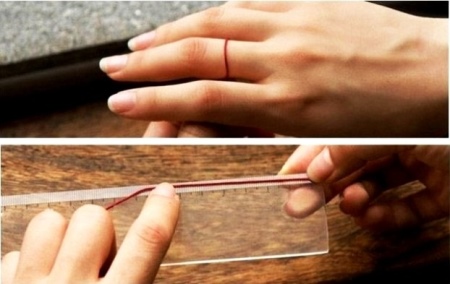 There is another method using thread. Here, one revolution around the circumference of a finger is enough to find out how many centimeters are around the circumference. The resulting segment is applied to a special table.