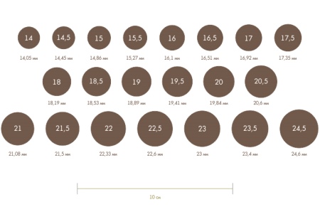 The fractional result is rounded up to half. If the finger is narrow and there is no problem with the passage of the product through the middle phalanx, then the resulting number can be safely rounded down to the nearest value. For example, 16.1 cm or 16.2 cm may well correspond to 16 ring sizes.
