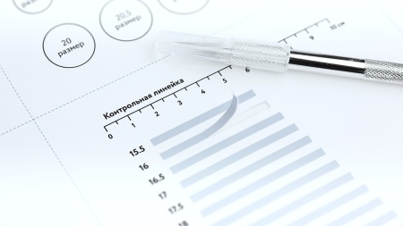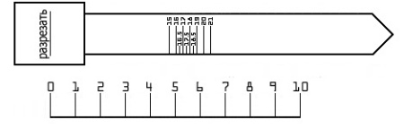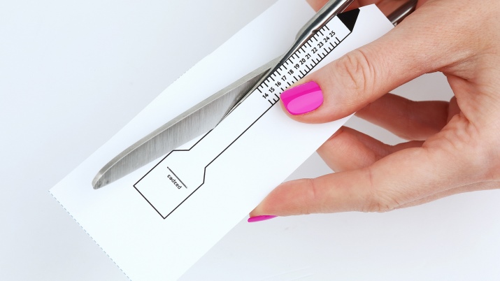 Make a cut along the vertical line on the left. Then insert the pointed end of the strip there, wrapping the “device” around the finger. The scale will indicate the size of the product.