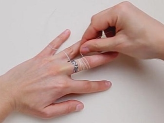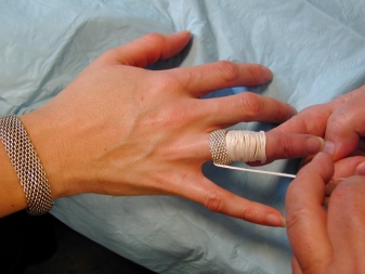 Having threaded the thread into the eye of the needle, it must be carefully inserted under the ring from the side of the nail, and the finger should be wound tightly with the rest. The turns should be tight, without gaps. Next, you need to slowly pull the end of the thread located at the base of the finger until the ring is removed.