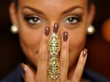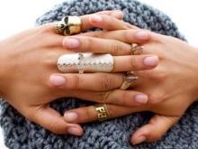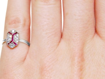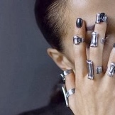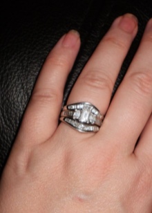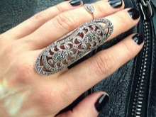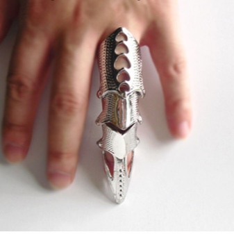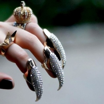 They are worn only on the upper phalanges and are decorated with overlays in the form of nail plates. Silver-colored zirconium metal rings look great with a white or golden hue. Lining can be trimmed with zircon - a semi-precious artificial stone, which, because of its beauty and brilliance, is called the "little brother of diamond." Such an accessory is cheaper than a gold jewelry with diamonds, and looks just as immaculate and magnificent.