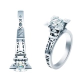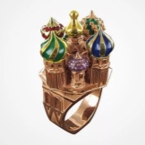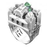 One of the most unusual design groups. Not every woman will wear a jewelry with the Kremlin or the Eiffel Tower on her finger. Such accessories are made in a variety of techniques and stylistic directions. There are elegant, sophisticated models with the silhouette of a famous building, and there are large, massive rings with relief images of towers, domes and pyramids.