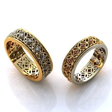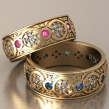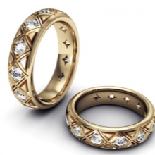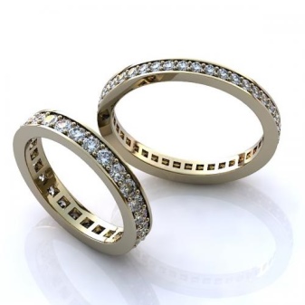 To decorate wedding rings, small gems of the same size and shape are most often used, which are arranged in a row along the outer side of the jewelry or at its end. To fix them, they often use channel brackets or corners, in which the stones are inserted into the holes formed in the jewelry metal and held there by small balls of the same metal.