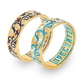 Models with a rotating insert are encrusted with precious stones or decorated with strips of another metal, often contrasting in color, for example, green, red or black. Twisting inserts are great for all sorts of inscriptions or drawings. It can be rings with names, hearts, pigeons, flowers. You can write a wish, an oath, a prayer on them, beat out a solemn or memorable date for the newlyweds.