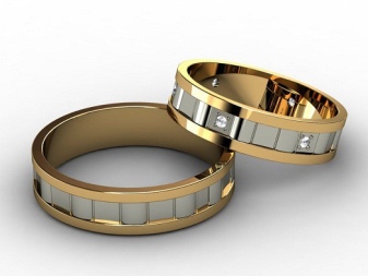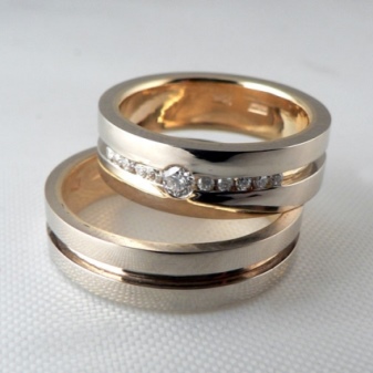 Models of yellow gold are very popular, on the outside of which there is an insert of white gold with a thin thread, complemented by a scattering of diamonds.