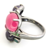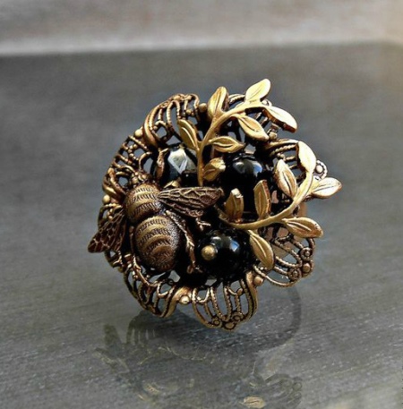 Looks very impressive vintage ring with black stones and Swarovski rhinestones called "Magic Bumblebee". A beautifully executed jewelry with detailed fittings in the form of a flower and a bumblebee landing on it, despite its bulkiness and massiveness, will be a successful addition to the everyday look. Such a ring can be worn with a trouser suit of light and dark colors, as well as a medium-length lace dress.