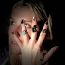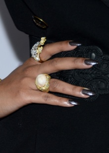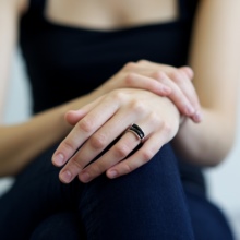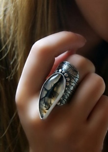 A ring with black agate will perfectly fit a small black dress. The image can be diluted with a thin belt, shoes and a metallic bag, as well as a gray jacket.