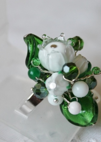 A handmade ring with agate and beads in the shape of a lily of the valley in the style of a lampwork will give a special charm to the spring look. Such a ring will be a wonderful completion of a light romantic image and fill it with tenderness and grace. The ring will be in perfect harmony with the summer flowing dress and high-heeled sandals.
